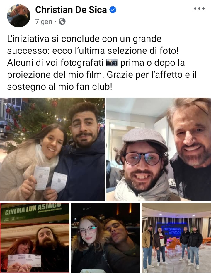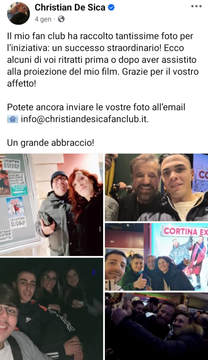 L’ultima iniziativa lanciata è stata promossa sulla pagina ufficiale di Christian. Abbiamo offerto la possibilità a chi si scattava una foto con i biglietti del film Cortina Express (il film di Natale) di comparire sulla pagina ufficiale, che è seguita da tantissimi fan. Per tutte le novità e iniziative, segui questa sezione.